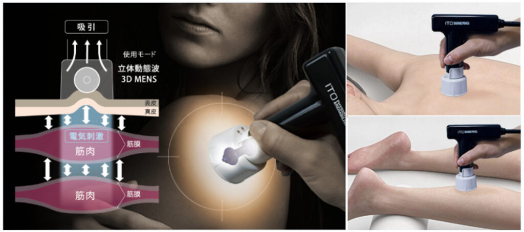 3D MENSモードは、μA(マイクロアンペア)単位の極めて微弱な電流を立体的に流す治療モードで、神経や筋を興奮させることなく、細胞レベルでの代謝促進と組織修復を目的としています。