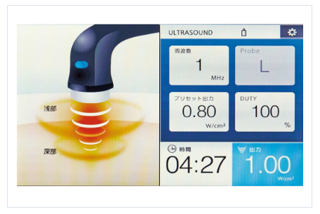 超音波の物理的振動エネルギーが体内組織に伝わることで、微細なマイクロマッサージ効果と温熱効果を生み出し、疼痛の軽減・筋緊張の緩和・血流促進を実現します。
