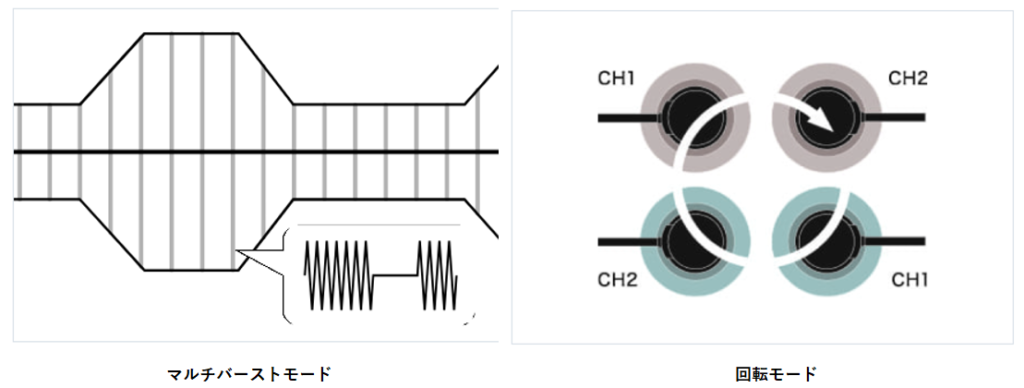 マルチバーストモードは、通電波形を一定周期で断続的(バースト)に出力することで、筋や神経への刺激をリズミカルに変化させる機能です。