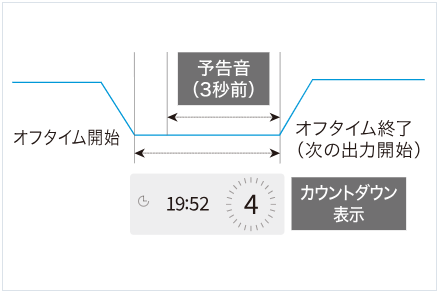 予告音を設定すると、オフタイムが終了する3秒前から予告音が鳴り、また、オフタイムを3秒以上に設定するとオフタイムの残り時間がカウントダウン表示される「予告音機能・カウントダウン表示機能」も搭載。