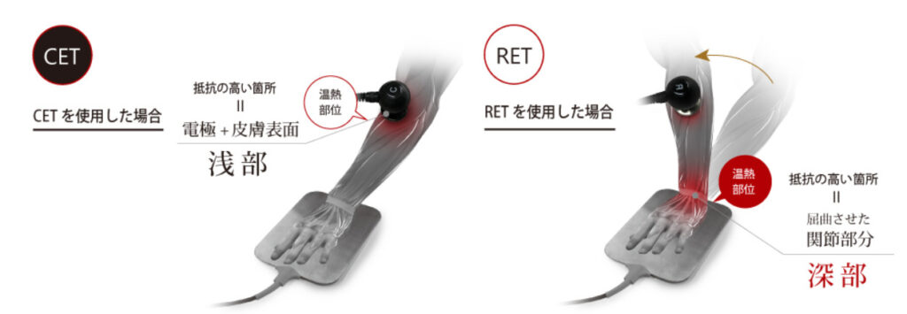 CETとRETを使い分けることで、浅層と深層への連続的かつ選択的な温熱刺激が可能となり、施術者は症状や目的に応じて精密な温熱プログラムを設計できます。