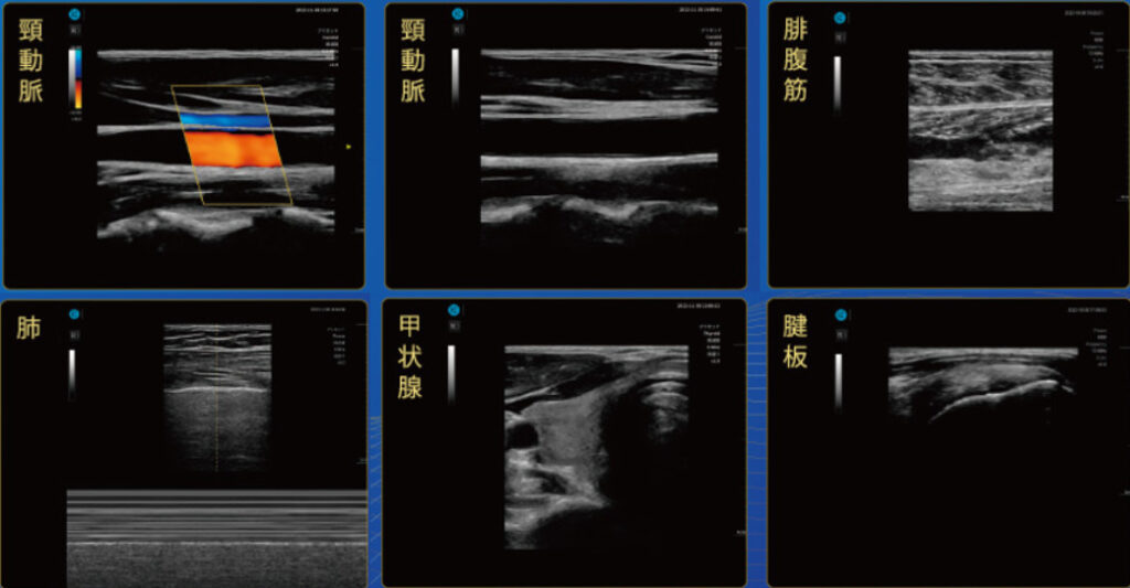 • 5〜12 MHzの高周波リニアプローブで、浅部筋骨格・血管・末梢神経など高解像度な描出が可能